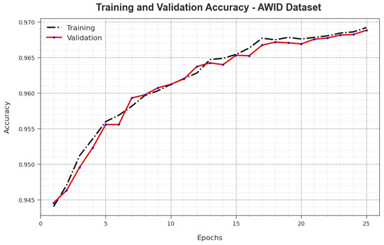 Figure 9 illustrates the training accuracy and values accomplished by the NIDS-LOFSDL algorithm on the AWID dataset. is determined by evaluating the NIDS-LOFSDL methodology on the TR dataset, whereas the value is computed by calculating the outcome on a separate testing dataset. The outcomes show that both the and values increased with an upsurge in the number of epochs. Therefore, the performance of the NIDS-LOFSDL methodology enhances the TR and TS datasets, with an increase in the number of epochs.