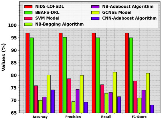 To ensure better results of the NIDS-LOFSDL technique, an extensive comparative analysis was conducted and the results are shown in Table 4 and Figure 11 [24,25]. The simulation values state that the SVM, NB-Bagging, NB-Adaboost, GCHSE, and CNN-Adaboost approaches achieved the worst performance. However, the BBAFS-DRL approach demonstrated a considerable performance with an of 95.04%, of 95.22%, of 95.06%, and an of 95.04%. Nevertheless, the NIDS-LOFSDL technique outperformed all other models with a maximum of 96.92%, of 96.92%, of 96.92%, and an of 96.92%. These outcomes confirm the effective performance of the NIDS-LOFSDL methodology on IDS.