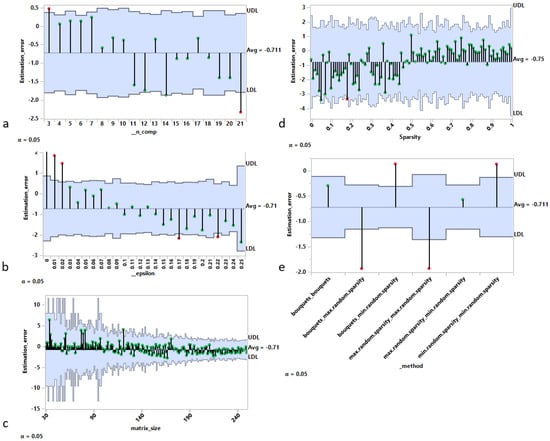 - Panel e shows the average estimation error for each of the six possible generation methods obtained by combining pairwise the bouquets method, the minimum sparsity level method, and the maximum sparsity level method for the generation of the random matrices W and H (Algorithm 4). The results show clearly that: