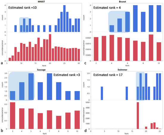 and vs. rank for (a) MNIST, (b) Sausage, (c) Brunet, and (d) Swimmer datasets. The shaded area corresponds to the first region of the CUSUM chart with three consecutive positive values. The selected rank is determined by the left edge of this area.