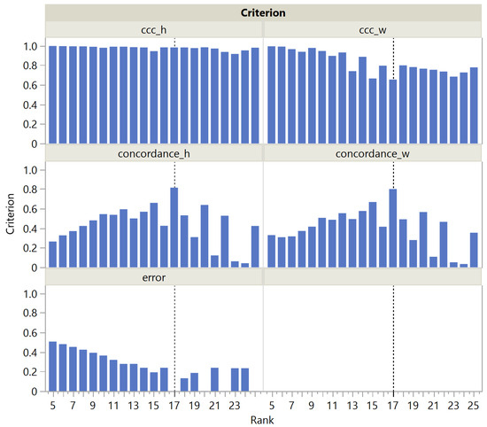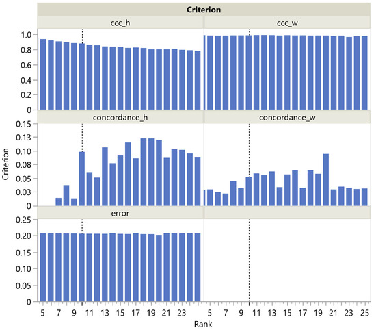 In this section, we examine the main sources of rank estimation error for the best performing criterion, , as shown in the previous Section 3.1.1, using the analysis of mean representation [29]. In Figure 2, each panel contains a decision chart with the following elements: