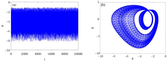 The hidden chaotic attractor of system (3) for when parameters , , , , , , and initial value . (a) Time series of variable ; (b) phase portrait in the plane.