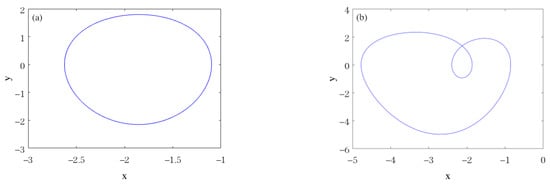 The hidden period attractors of system (3) for different values of when , , , , , , and initial value . (a) Period-1 attractor for ; (b) period-2 attractor for .