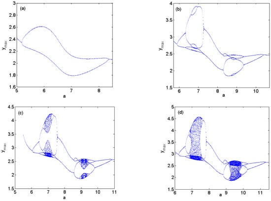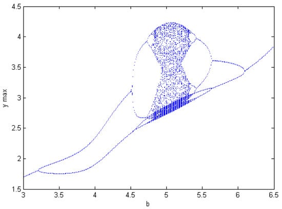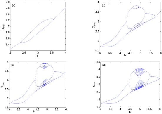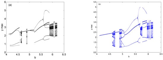 As we all know, the process of period-doubling bifurcation to chaos is an interesting behavior worth further study. In some nonlinear dynamical systems, reverse period-doubling sequences can be observed after period-doubling bifurcation. Periodic orbits can occur and then disappear via reverse bifurcation sequences. The phenomenon of the creation and annihilation of periodic orbits was named antimonotonicity [39]. It can be detected in system (3) by changing the value of in a certain range for several discrete values of when , , , , , and initial value . The bifurcation diagrams with controlling parameter changing are calculated and drawn in Figure 13. From Figure 13, we can know that the period-2 bubble (primary bubble) is obtained for , and the period-6 bubble is observed for . With increasing, more full bubbles appear until chaos occurs (full Feigenbaum remerging tree (fFrt) at and ). Similarly, the antimonotonicity in system (3) can also be detected with controlling parameter changing for discrete values of when , , , , and initial value . The bifurcation diagrams when controlling parameter b changing are depicted in Figure 14, which indicates that when , system (3) shows a period-2 bubble (Figure 14a); when , system (3) exhibits a period-6 bubble (Figure 14b); when or , fFrt is also found in system (3).