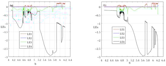 Then, when we choose system parameters , , , , , , and initial values and (−2,−1,−2,0), respectively, the bifurcation diagram of variable with parameter are drawn in Figure 4a,b, respectively. Figure 1, Figure 2, Figure 3 and Figure 4 indicate that parameter b has much effect on the dynamics of system (3). When fixing other parameters, the change of b can induce the diversity of the dynamic behaviors of system (3). To confirm this result, the corresponding Lyapunov exponents are calculated and given in Figure 5a,b, respectively, which coincide with the result in Figure 4. Figure 4 and Figure 5 suggest that the hidden dynamics of system (3) is not only dependent on system parameter , but also relative to the initial value of the system.