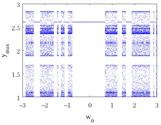 Firstly, the effect of initial state of memristor on the hidden dynamics of system (3) is concerned. To this end, select system parameters , , , , , , , , , , we change from −3 to 3, and the bifurcation diagram of variable is shown in Figure 6, which suggests that system (3) shows different dynamics with increasing from −3 to 3, such as period and chaos.