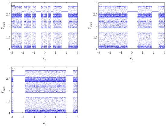 The bifurcation diagram of variable maxima with changing for , , , , , , and different initial values. (a) Initial value ; (b) initial value .