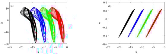 Offset boosting of the chaotic attractor in system (5). (a) Phase portrait in plane; (b) phase portrait in plane. In (a,b), the lines with different colors correspond to different values of : red line for , green line for , blue line for , and black line for .
