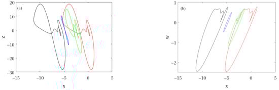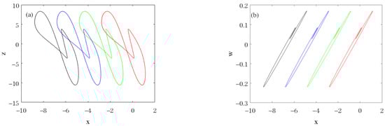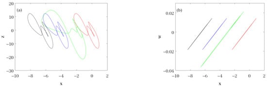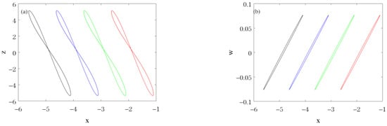 Offset boosting of the period-4 attractor doesn’t appear via transformation with , , , , , , , initial value . (a) Phase portrait in the plane; (b) phase portrait in the plane. In (a,b), the lines with different colors correspond to different values of : red line for , green line for , blue line for , and black line for .