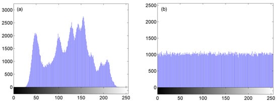 The histograms of Figure 15a,b are depicted in Figure 17a,b, respectively, from which we can see that the original image has prominent statistical characteristics. In contrast, the encrypted image has strong randomness. This result illustrates that the proposed encryption method can successfully hide much information about the original image, which makes it difficult to be attacked by statistical attackers.