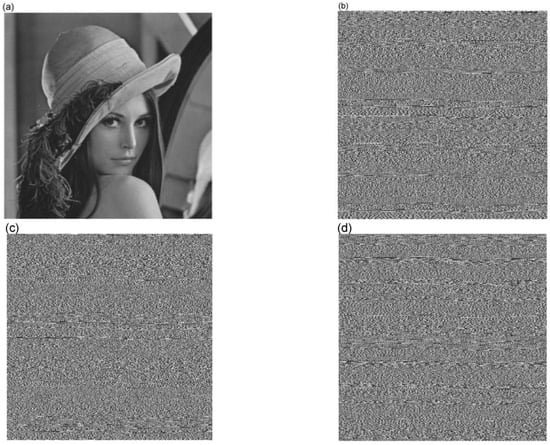 The degree of agreement between the decrypted image and the original image is observed by slightly changing the partial key during the decryption process. With all correct keys, , , , , , , , , , , , , , the decrypted result is depicted in Figure 18a. Decryption results by changing the key , , slightly are given in Figure 18b–d, respectively. From Figure 18, we know that even if only one key changes slightly, the decryption result is a messy image, which is meaningless. This result suggests that the decryption process of the proposed method has strong sensitivity to the key.