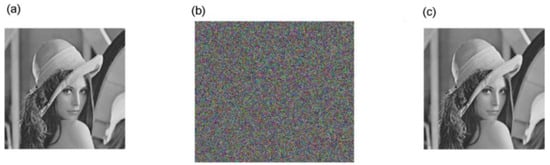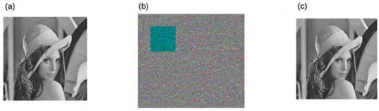 To demonstrate the robustness of the proposed encryption algorithm. Crop attack and noise disturbance have been considered. A block of 100 × 100 pixels was removed from the encrypted image (Figure 20b) and the decrypted image can be gained as Figure 20c. Figure 20 shows that, even if part of the image information is lost, it can recover the original image very well. It suggests that the proposed encryption algorithm can resist a crop attack effectively.