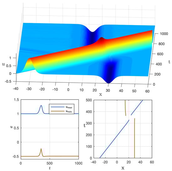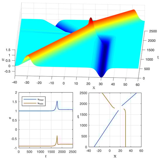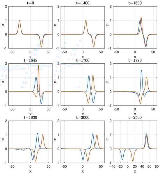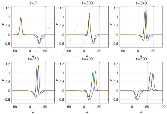 The process of two soliton interactions in an integrable mKdV model and non-integrable Schamel equation is presented in Figure 5 and Figure 6 for the simulations presented in Figure 1, and Figure 2 correspondingly. The interaction of bipolar solitons leads to an increase in the amplitude of the resulting impulse. However, within the mKdV model, the resulting amplitude presents the linear superposition of the modules of amplitudes of the initial solitons. The amplitude of the resulting impulse within the Schamel equation is less due to the additional radiation that occurs because of the non-integrability of this equation and the inelastic interaction of solitons. Also, in the mKdV model, the interacting solitons restored their shapes and amplitudes after the interaction, and the biggest wave which can form in the soliton gas has an amplitude equal to the sum of all solitons; this scenario requires very specific soliton phases and order of solitons [19,20]. In the framework of the Schamel equation, when solitons have close amplitudes by modulus (Figure 5), the scenario, on the one hand, is less extreme than the mKdV case because the resulting impulse is less than in the mKdV case. On the other hand, the amplitude of the largest soliton increases after the interaction. This may lead to the consumption of the energy of the largest soliton in soliton gas and, as a result, it may be considered a new mechanism of a freak or rogue wave formation due to the non-integrable effects. When the initial amplitudes of the solitons significantly differ from each other, the resulting impulse in the Schamel equation is again less than in the mKdV case, but not significantly, because the non-integrable radiation is small in this case (Figure 6). Moreover, after the interaction, the solitons have similar shapes as they had before the interaction.