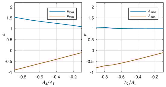 To study the dependence of extrema (maximum and minimum) of wave fields against the ratio of the amplitudes of the interacted solitons, as well as the values of amplitudes of the largest and smallest solitons after the soliton interaction, Figure 3 is analyzed. The amplitude of the largest soliton before the soliton collision was kept constant and equal to 1. The amplitude of the second soliton was changed from to . It is observed that the minimum of the wave field for all considered ratios is equal to the amplitude of the smallest soliton and does not fall below this value over time. Thus, the straight red line can be seen in the left plot of Figure 3. The value of before and after the soliton interaction is not the same for all ratios . This difference can be seen for amplitudes less than (see red line on the right plot of Figure 3). This means that the negative soliton transfers part of its energy to the positive one only when their amplitudes are comparable in modulus. Accordingly, this effect does not appear when the amplitude of the negative soliton is considerably smaller than the amplitude of the large positive soliton. A similar conclusion can be made for the wave field maxima: the amplitude of the largest soliton after the soliton interaction exceeds its initial value (which is equal to 1) only for ratio bigger than .