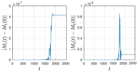 The first invariant is known as the Casimir invariant or the mass invariant. It characterizes the mass or the total “amount" of the wave field at any given time t. The second invariant is the momentum invariant. These invariants play a crucial role in evaluating the accuracy and reliability of numerical methods employed to solve the Schamel Equation (1). Their evolution within the Schamel equation is presented in Figure 7. It can be seen that the accuracy of the calculations is quite high, and the first and second integrals are preserved with an accuracy equal to and .