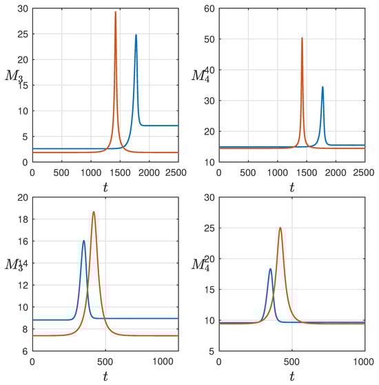 The third and fourth moments corresponding to the skewness and the kurtosis in the theory of turbulence vary in time and change their values during the soliton interaction. Their evolution and comparison for the two equations are shown in Figure 8 (top plot—in case of the simulation displayed in Figure 1) (bottom plot—in case of the simulation displayed in Figure 2). These moments increase in the moment of soliton interactions due to the increase in amplitude of the resulting impulse. The peaks of the moments are predictably higher within the mKdV equation than in the Schamel equation because the growth of impulses is larger in the mKdV equation as was shown in the previous section. By analogy with the maxima of wave fields, in the integrable mKdV equation, due to elastic soliton interactions, the values of the third and fourth moments before and after the interaction are identical. The same conclusion can be made for the Schamel equation in case of large differences in amplitudes of interacted solitons. The radiation due to the non-integrability of this equation is small enough. However, when the amplitudes of solitons are close in modulus ( is bigger than 0.7), the value of the moments after the interaction becomes bigger than before the interaction. This means that in the case of the mKdV soliton interaction, the amplitudes of interacted solitons are higher than in the Schamel case. However, if in the Schamel equation, a large time of evolution of the wave field consisting of a large number of solitons is considered, the accumulation of energy in large solitons can contribute to the emergence of unexpectedly large waves in the system. Thus, non-integrability can be considered as a factor provoking the rogue wave formation.