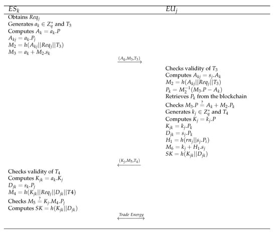 recursively repeats these processes and can finally obtain . Then, can obtain and can check the integrity of the message using . After that, generates and a timestamp ; computes , , , and ; and transmits . receives the message and checks the validity of ; computes , , and ; checks ; and retrieves from the blockchain. After that, generates timestamp and ; computes , , , , , , , and ; and sends to . receives the message; checks the validity of ; computes , , and ; checks ; and computes . Then, can be used for further communication, and and trade energy. When the energy trading finishes, transmits to encrypting it using . The mutual authentication in the responding phase is summarized in Figure 2.