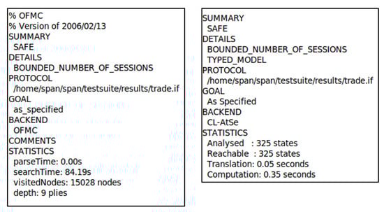 We simulated the proposed scheme using the AVISPA simulation tool [29]. The AVISPA simulation tool can verify resistance to replay attacks or Man-in-the-Middle (MITM) attacks of an authentication protocol by checking the freshness and secrecy of transmitted messages during the authentication process. We wrote the proposed method in the HLPSL language [52] and simulated it with the “On-the-Fly Model Checker (OFMC) [53]” and “Constraint Logic-based Attack Searcher (CL-AtSe)” [54] models. The execution results are shown in Figure 3, and the proposed scheme is safe under the two models. Therefore, we formally verify that our scheme has resistance to replay and MITM attacks.