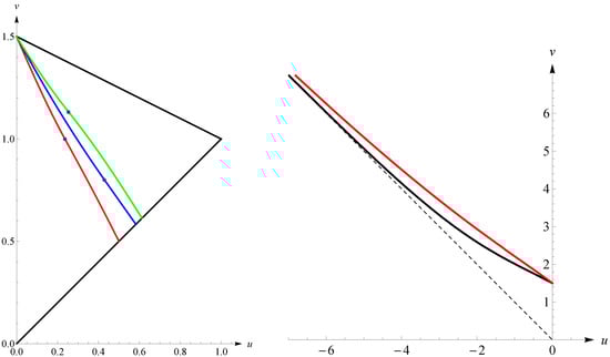 In Figure 7, Figure 8 and Figure 9, the sections of the stability region by the planes , and are represented, which are the stability regions for the three families of equations with two delays. The stability of the family