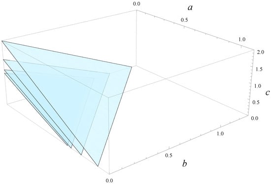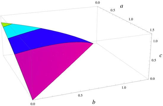 The surfaces –, forming the boundary of the stability region of family (51), are represented in Figure 6. The points placed in the first octant not above the boundary compose the region of uniform stability. By excluding the surfaces – and the point from it, we obtain the region of exponential stability.