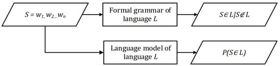 A rough comparison of the functionality of a formal grammar (top) and a language model (bottom) for some language L, where S represents a string, and represents the probability that S belongs to L.