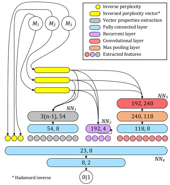 The dataset used to evaluate the proposed methodology approach for this experiment is envisioned as a series of matrices containing perplexity values obtained through standalone language model evaluation. In order to prepare the dataset, several standalone language models (M1, M2, and M3) that output different perplexity values for the same text were needed, and also several series of textual sentences (T1, T2, and T3) not previously used for the training or fine-tuning of M1, M2, and M3. The final dataset is obtained by evaluation of M1, M2, and M3 using T1, T2, and T3 as the test sets.