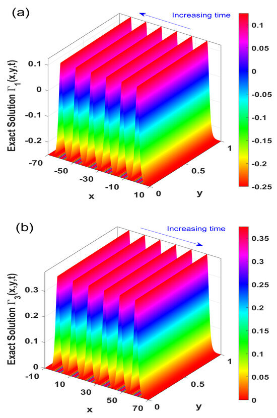 Figure 1. The time evolution of the exact solutions (a) and (b) . The parameter is supplied by with .