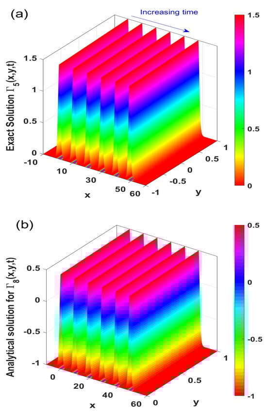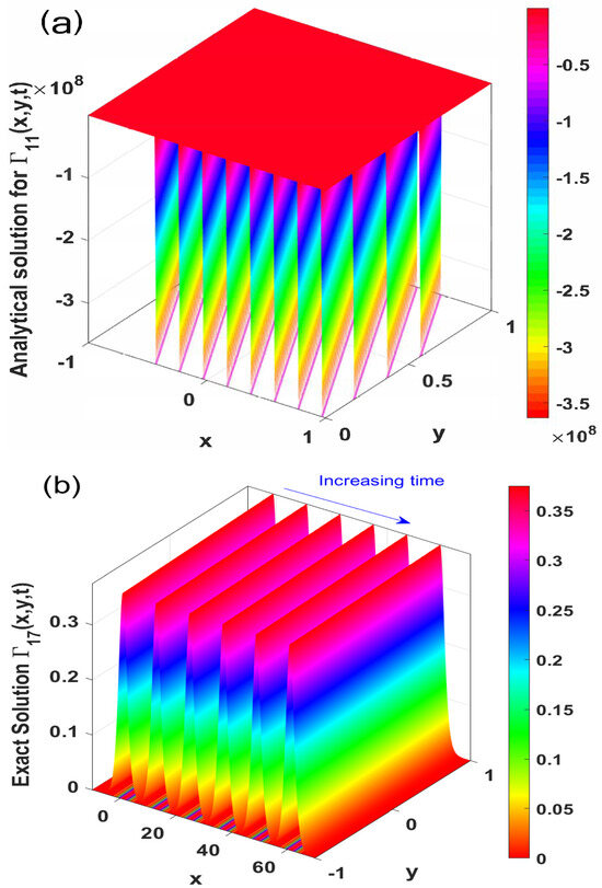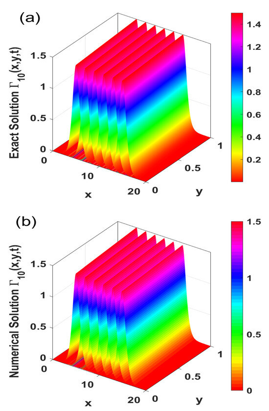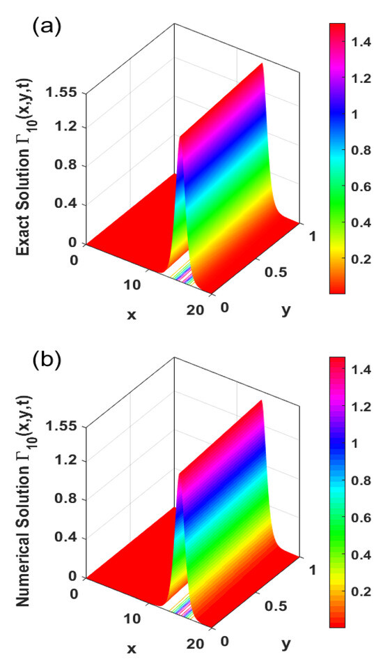 The analytical (a) and numerical (b) solutions for are shown in 3D. The parameter values are determined by , , , and