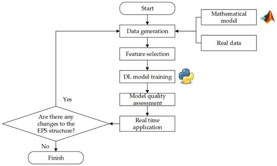 The first step in the flowchart shown in Figure 1 is data generation. To form a data sample, two sources can be used: the results of mathematical modeling and real data obtained during the registration of transient processes in real EPSs. The next stage is the selection of features to increase the speed of training procedures for the DL model. After training, the DL model is tested, and the classification quality criteria are analyzed. If the classification quality is unacceptable, the DL model is retrained with the correction of hyperparameters or a set of features. Once an acceptable classification quality is achieved, the trained DL model is integrated into the EC EPS process, which runs in real time. When there is a change in the EPS structure [43], the DL model is retrained. The following is a detailed description of each of the stages of the flowchart shown in Figure 1.