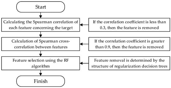 Thus, a three-step procedure combining the Spearman correlation coefficient analysis and the use of the RF algorithm [48] is used for feature selection. The Spearman correlation coefficient is calculated using the following equation: