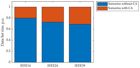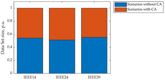In this study, numerical modeling performed in the MATLAB/Simulink environment was used to generate a data sample. The standard mathematical models EPS IEEE14 [16], IEEE24 [17], and IEEE39 [18] with modified load values and SG powers were used. A detailed description of the mathematical models used is given in Appendix A, Appendix B, and Appendix C. To select CAs, an algorithm adapted for the analysis of TS and SSS from the study [47] was used. To simulate a series of transient processes, a proportional change in loads and generations was performed in the EPS models used.