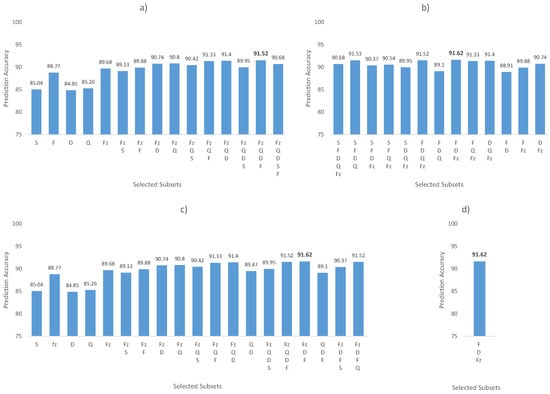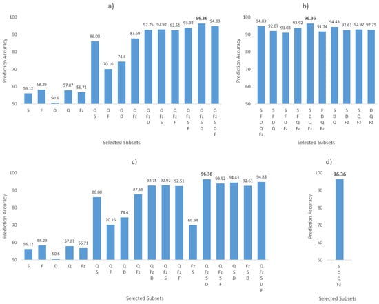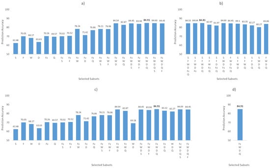The results of feature selection using experimental data, where bold numbers indicate the highest prediction accuracy with the best subset: (a) Baseline 1 (Sequential), (b) Baseline 2 (Recursive), (c) Baseline 3 (Step-wise), and (d) Exhaustive.