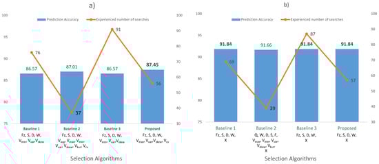 The feature selection results of experimental data with causality applied, where bold numbers indicate the highest prediction accuracy with the best subset: (a) Utilized organized features , , where all possible subsets are 8191. (b) Utilized organized features , , and , where all possible subsets are 16,384.