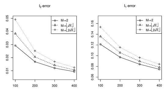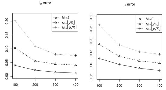 The simulation results are shown in Figure 1, Figure 2 and Figure 3 for Cases 1–3, respectively. According to Figure 1, we can see that both the error and the error decrease as the network size (n) increases, which means the estimation accuracy of generally improves as n increases. On the other hand, both the error and the error increase as increases, corresponding to variation in the sparsity level from sparse to dense, that is, the estimation accuracy of improves for sparse cases. Similar conclusions can be obtained from Figure 2 and Figure 3 relative to that derived from Figure 1.