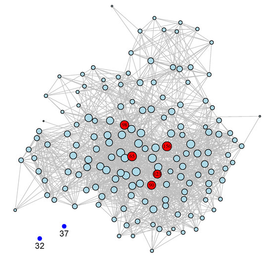 Enron email dataset. The vertex sizes are proportional to nodal degrees. The red circles indicate a nodal degree of more than 43. The blue circles indicate isolated nodes.
