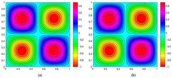 (4) By substituting and the above data into Problem 4, we calculate four RDEFE solutions at and document the CPU runtime and errors (, , , ), listed on the third and fifth columns in Table 1, where the contours of RDEFE solution at and are shown in Figure 1a.