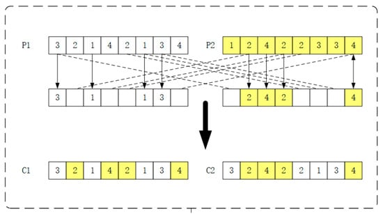 For the machine-coded MS, multipoint crossover is used as the crossover operator. In this operator, r(r < L) positions are first selected. Then, two offspring codes are generated by exchanging the positional elements of multiple-parent machine codes. Because each gene in these two codes represents a machine selected by a fixed operation, the number of operations does not change throughout the search. Simultaneously, the selected parents are viable, and this crossover ensures that viable offspring are generated. The specific operation is shown in Figure 4: