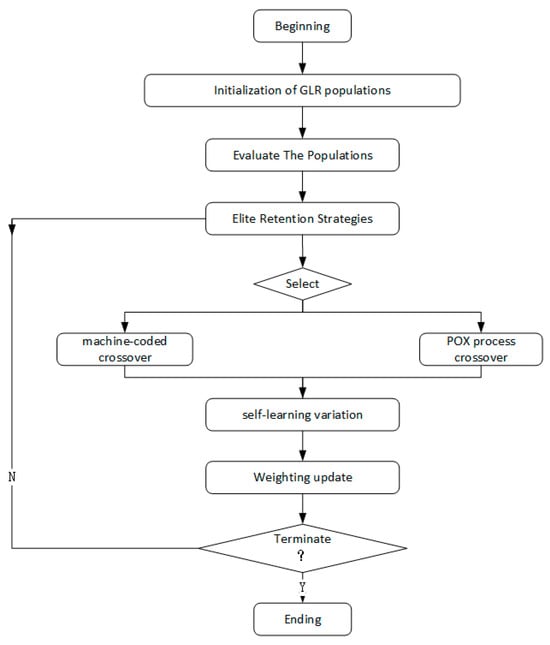 Intelligent optimization algorithms currently in common use for solving FJSPs include the genetic algorithm, the ant colony optimization algorithm, the particle swarm optimization algorithm, the gray wolf algorithm, the taboo search algorithm, etc. With the introduction of the genetic algorithm (GA), the use of the GA for solving FJSPs has evolved. A study by Amjad et al. [] showed that a large number of studies on the FJSP problem in recent years have used the GA for solving the problem, and in particular, its excellent global optimization capability and strong robustness make the GA one of the best algorithms for dealing with global problems. Xiaoyu Gao et al. proposed a genetic algorithm based on reinforcement learning that used Q-learning to self-learn crossover probabilities and improve the generalization ability of the genetic algorithm to achieve a solution to the large-scale flexible job shop scheduling problem [].