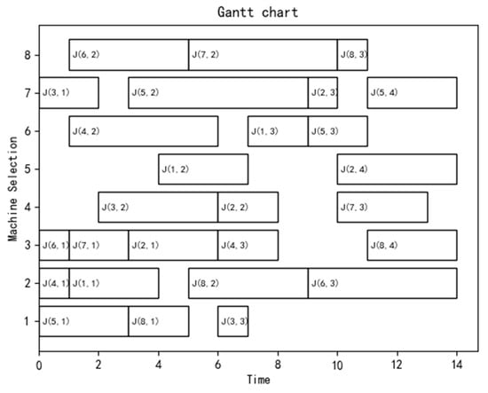 The experimental results are shown in Figure 6 and Figure 7. The maximum completion time in reference [] was 33. The scheduling scheme obtained by the algorithm in this paper had a maximum completion time of 14, which is better than that in reference [], and it is more reasonable in terms of machine allocation and process sequence. Comparing the data calculations in Table 3, the algorithm proposed in this paper improved the efficiency by 57.5%.