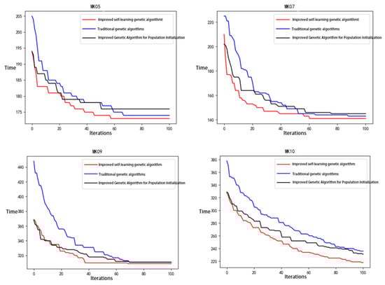 In order to illustrate the performance of the self-learning genetic algorithm proposed in this paper in comparison with the traditional genetic algorithm and the improved genetic algorithm in solving the FJSP problem, it was applied to the MK01–MK10 benchmark examples and was run to output its maximum completion time with the number of population iterations.