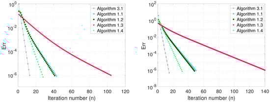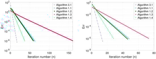Let us provide some numerical examples that demonstrate the effectiveness and efficiency of the suggested algorithms. We will compare the performance of Algorithm 11 (also known as Algorithm 11) with Algorithms 1, 2, 3 and 10 (also known as Algorithms 1, 2, 3, and 10, respectively). Kindly note that the renumbering of the article occurred due to the change in the numbering style in the template. All codes were written in MATLAB R2020b and performed on a PC Desktop. Intel(R) Core(TM) i7-6600U CPU @ 3.00 GHz 3.00 GHz, RAM 32.00 GB.