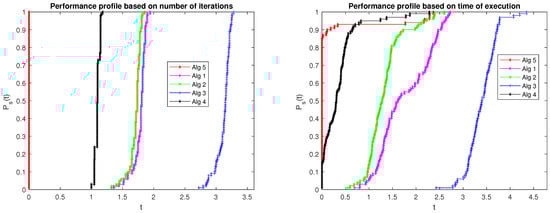 where “eye", “randn", “rand", and “ones" are MATLAB functions. We used as the stopping criterion for all the implementation. The numerical results are shown in Table 1 and Figure 1. Furthermore, we run the algorithms for 100 randomly generated starting points to check the performance of the algorithms using the performance profile metric introduced by Dolan and More [34], which is widely accepted as a benchmark for comparing the performance of algorithms. The details of the setup of the performance profile can be found in [34]. In particular, for each algorithm and case we defined a parameter which is the computation value of algorithm for solving problem case such as the number of iterations, time of execution, or error value of Algorithm to solve problem . The performance of each algorithm is scaled concerning the best performance of any other algorithm in , which yields the performance ratio