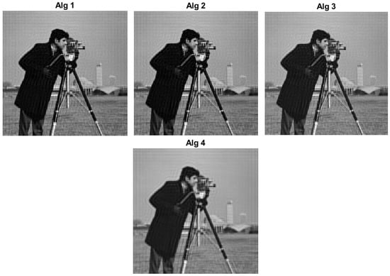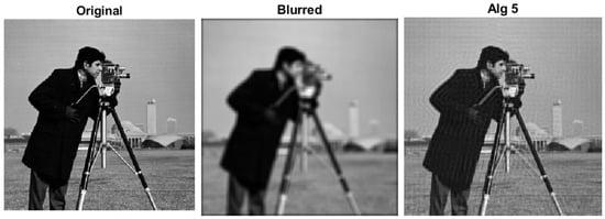where is the Euclidean norm of a and is the -norm of a. Various scientific and engineering fields have found the problem to be a valuable tool. Over the years, several iterative techniques have been developed to solve Equation (62), with the earliest being the projection approach introduced by Figureido et al. [36]. Equivalently, the LASSO problem (62) can be expressed as an SVIP when and , where and are the indicator functions on C and Q, respectively. We aim to reconstruct the initial image a based on the information the blurred image z provides. The image is in greyscale and has a width of M pixels and a height of N pixels, with each pixel value within the range. The total number of pixels in the image is The signal-to-noise ratio, which is determined by the amount of noise present in the restored image, is used to evaluate the quality of the resulting image, and it is defined by