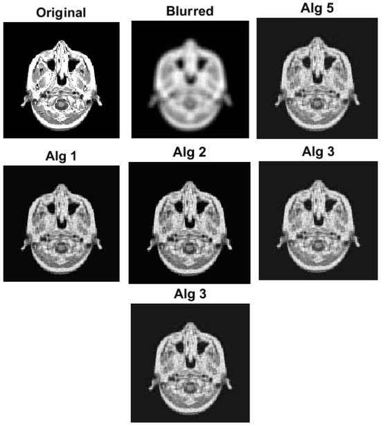 with a and being the original and restored images, respectively. In image restoration, the quality of the restored image is typically measured by its signal-to-noise ratio (SNR), where a higher SNR indicates better quality. To evaluate the effectiveness of our approach, we conducted experiments using three test images: Cameraman (256 × 256), Medical Resonance Imaging (MRI) (128 × 128), and Pout (400 × 318), all of which were obtained from the Image Processing Toolbox in MATLAB. Specifically, we degraded each test image using a Gaussian 7 × 7 blur kernel with a standard deviation of 4. We processed the algorithms using the following control parameters: Algorithm 11: For Algorithm 1, we take for Algorithm 2, we take for Algorithm 3, we take ; and for Algorithm 10, we take We also choose the initial values as and The numerical results are shown in Figure 3, Figure 4, Figure 5 and Figure 6 and Table 2. It is easy to see that all the algorithms efficiently reconstruct the blurred image. Though the performance of the algorithms varies in terms of the quality of the reconstructed image, we note that Algorithm 11 was able to reconstruct the images faster than other algorithms used in the experiments. This also emphasizes the importance of the proposed algorithm.
