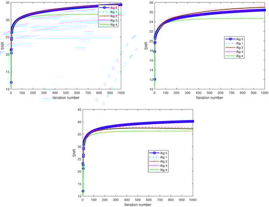 Graphs of SNR against iteration number. Top Left: Cameraman; Top Right: MRI; and Bottom: Pout.