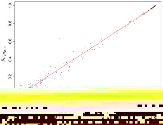 The random variable was defined as −log10, where the are the p-values obtained from the single SNP tests of association between disease and the kth SNP, = 1, …, . Here, is the number of SNPs used to estimate the pairwise correlations between the tests, denoted as (see Section 2.1 for details). The estimated pairwise correlations based on pairs of alleles () were plotted, as shown in Figure 1. The results indicate a clear linear trend between and , with an estimated slope of 0.996 when using linear least squares regression. These findings suggest that the correlation between test statistics can be reasonably estimated by the correlation between single SNP tests measured using , providing important insights into the genetic structure of the trait of interest at the DNA sequence level. In addition, the variance of the data points increases when the correlation between SNP tests () is close to 0. This is due to the fact that low correlation values make the estimation of the relationship between variables less stable and conversely for high correlation values. Hence, data points tend to cluster more closely together when the values of and are close to one.