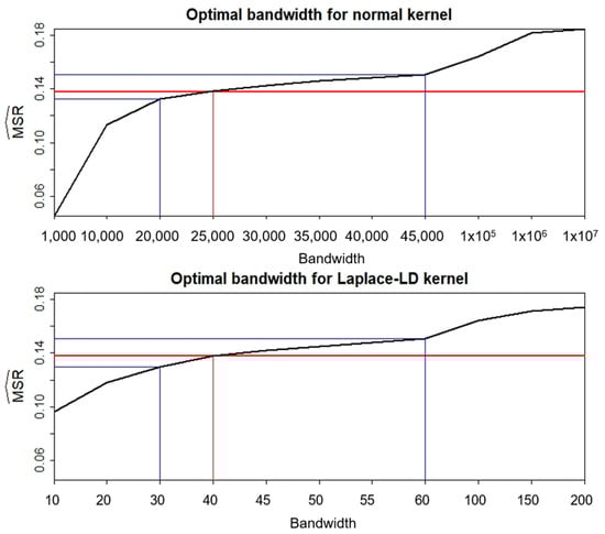Plots of the mean of against the bandwidth for normal and Laplace-LD kernels (horizontal middle line). The top and bottom horizontal lines illustrate the ranges for the bandwidth ranges of 20,000 to 45,000 for the normal kernel and 30 to 60 for the Laplace-LD kernel.