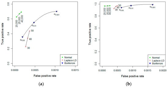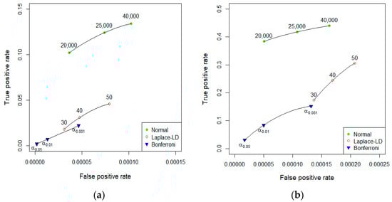 Bandwidths of 20,000, 25,000, and 40,000 were used for the normal kernel, and 30, 40, and 50 were used for the Laplace-LD kernel. The results were compared with Bonferroni corrections , , and . In practice, identifying significant regions rather than significant SNPs for the disease might be relevant, as there is no guarantee that a disease-predisposing SNP will be identified in the GWAS. Disease regions consisting of the SNPs within 100,000 base pairs of the disease-associated SNPs were constructed. The estimated true positive (TP) rate is the number of times at least one of the two disease regions was detected out of the replicate runs, while the false positive (FP) rate is the number of SNPs found to be significant that are not in any of the disease regions.