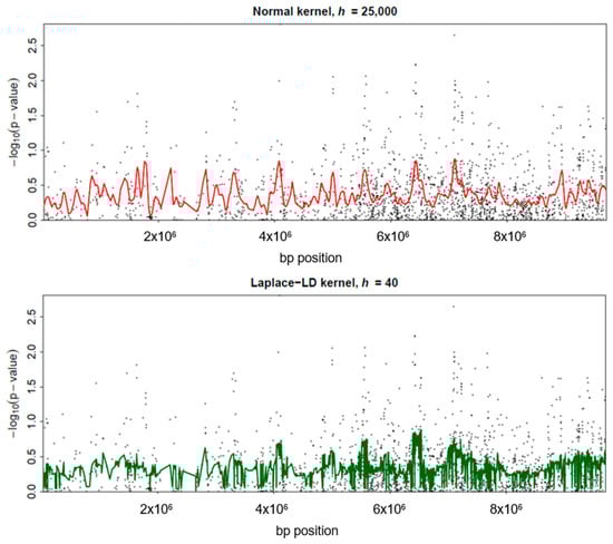 In order to determine the appropriate bandwidth values for the proposed method, the average value of based on 3000 replicates was calculated as = 0.1380. The optimal bandwidth was then obtained by plotting the estimated for normal and Laplace-LD kernels with different bandwidths, as shown in Figure 3. The horizontal line represents the estimated of the noise in 13,479 considered −log10(p-values) obtained from the single SNP tests. The optimal bandwidth for the normal kernel was found to lie in the range of 20,000 to 45,000, with a value of roughly 25,000 determining approximately equal and values. For the Laplace-LD kernel, the optimal bandwidth was roughly 40, with values in the range of 30 to 60 producing similar values as with the normal kernel. Note that the bandwidth ranges are not centered around , consistently with the observation that underestimates the noise in the data.
