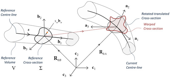 where and denote the position of the center-lines in the reference and current states with respect to the fixed Cartesian reference system; identify the points in the body cross-sections; are warping displacements; and, finally, are time-independent variables, with and spanning a two-dimensional domain such that , with , , , and for . Henceforth, the dependence of all scalar, vector, and tensor fields on the spatial variables (or ) and on the time t is understood and, hence, omitted.